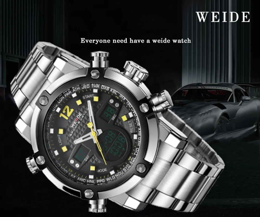 WEIDE Watch Men Relogio Masculino Watch Date Alarm Back Light Time Zone Quartz Watch Men Digital Wrist LCD Men Reloj Men Watch Brand: WEIDE Item: WH5205 Style: Sport, Casual, Business Display: Analog and LCD Digital Movement: Original Japan MIYOTA 2035 and LCD Digital Movement Feature: -Six active versions for option; -Flash around the circle clock wise; -Japan 2035 quartz movement and LCD digital moves with original battles; -Cool & special designed oversize watch dial; -Stainless steel watch band and stainless steel case; -Unique electronic platform 3d wear black logo on two links. -Watch crown with environmental ips bronze plating; -30 meters water resident (please don \ u0027t press any keys underwater ); -Walking on error ± 45 s/m; operating temperature:-10 ° c to + 50 ° c Specification: Case diameter: 5.0 Case thickness: 1.75 Band length: 16.8 cm Band width: 2.4 Band material: stainless steel