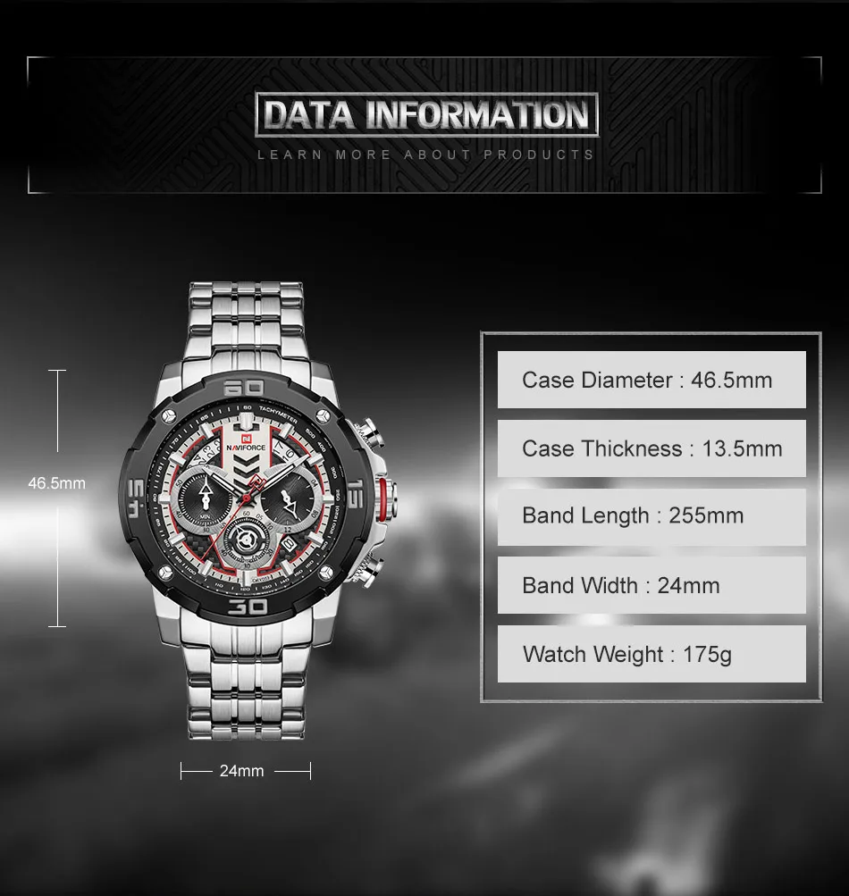 Model: NAVIFORCE NF9175Movement:Quartz Movementsteel strap:Dial Diameter: 46.5mmCase Thickness: 13.5mmBand Length: 25.5mmBand Width: 22mmProduct Weight:175gLeather strap:Dial Diameter: 46.5mmCase Thickness: 13.5mmBand Length: 26mmBand Width: 22mmProduct Weight:95gGender: Men Watch & Male Watches & Relogio MasculinoStyle: Fashion Watch & Business Watches & Sport WristwatchDial Window Material Type: Hardened Mineral GlassBand Material Type: Genuine Leather/ steel strapClasp Type: Buckle/ hook buckleFeature:Time, 30M Water Resistant,Date Week Display Luminous Hands,Chronograph