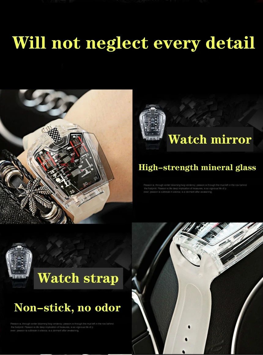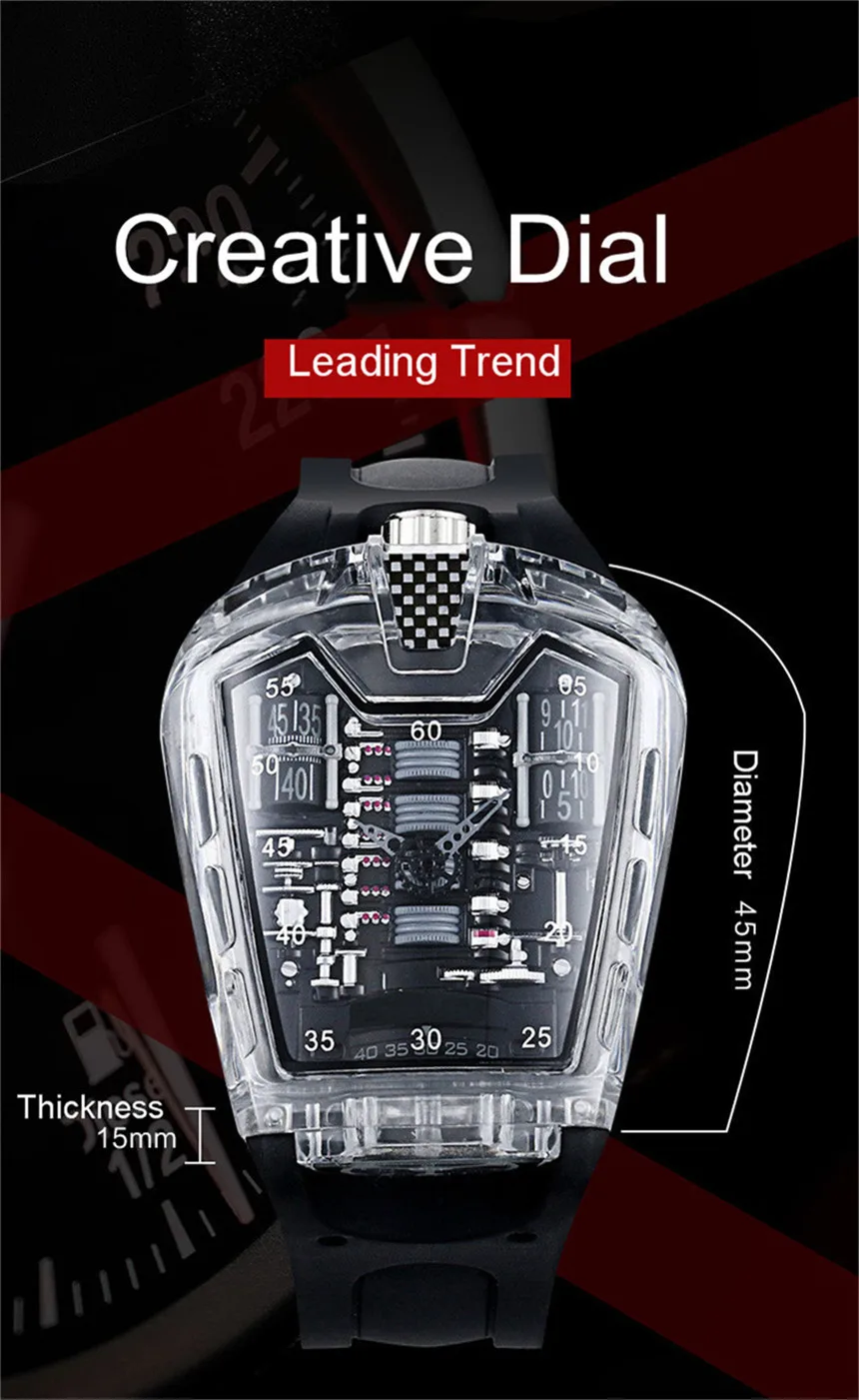 | Men's Fashion Trend Personality Classic Quartz Watch Luxury Racing Free Silicone Strap Clock Transparent Movemen Relogio |