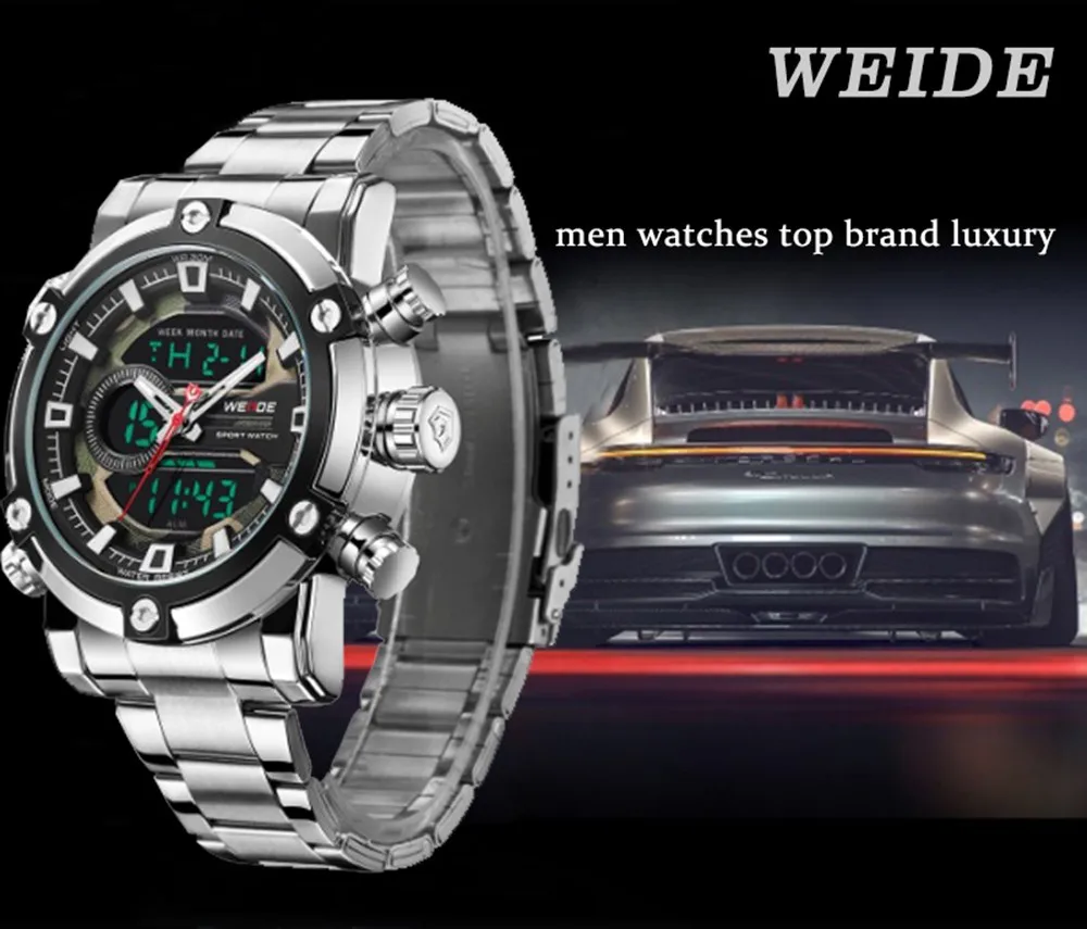 WEIDE Watch Men Relogio Masculino Watch Luxury Brand Men Digital Auto Date Quartz Watches Stainless Steel Watch Military Watch