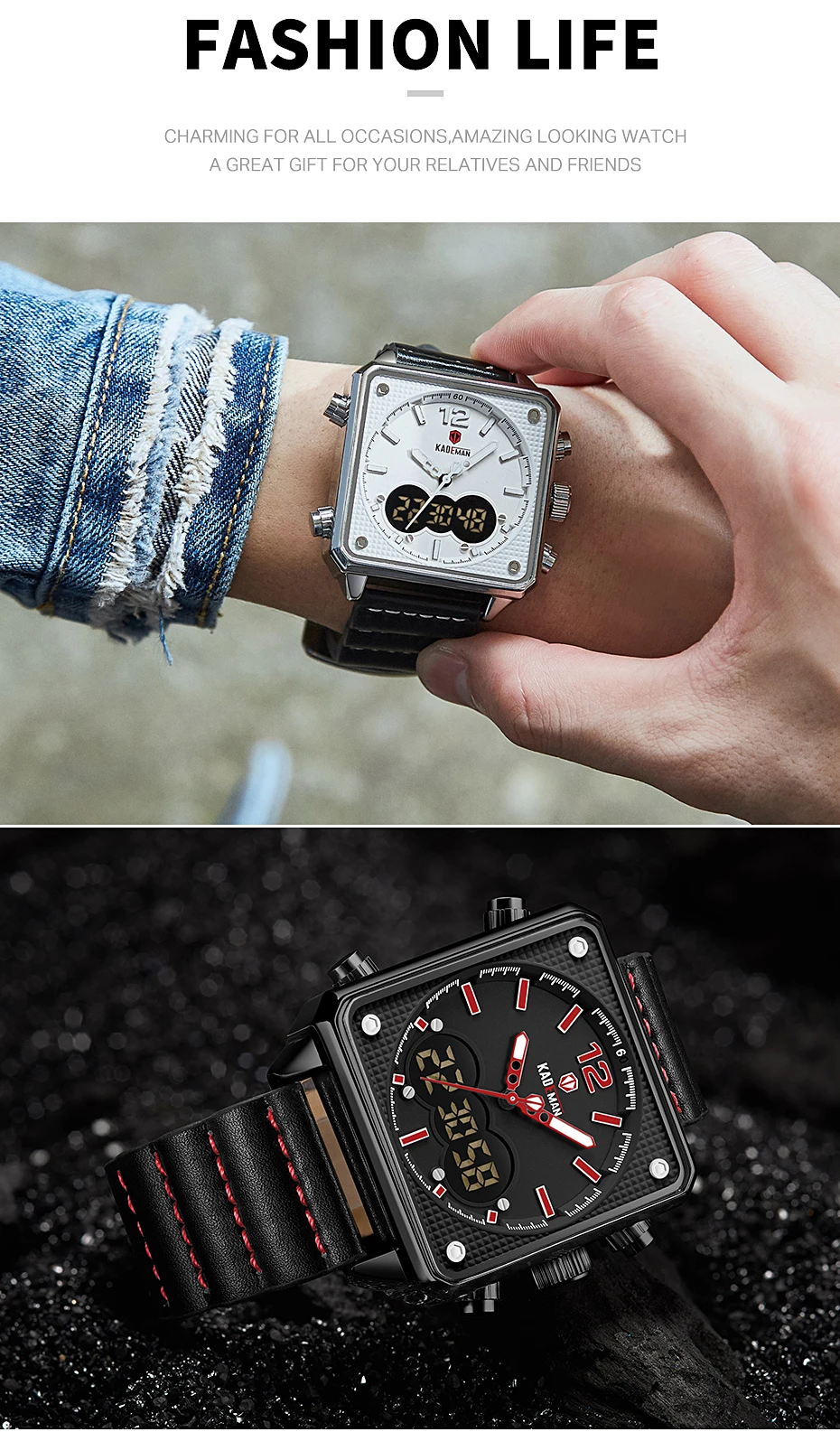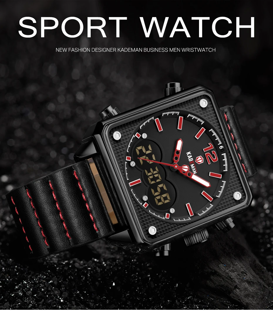 | Luxury Square Watch Men Original Sport Watch TOP Brand KADEMAN Dual Display 3ATM Tech Wristwatches New Leather Casual Male Clock |