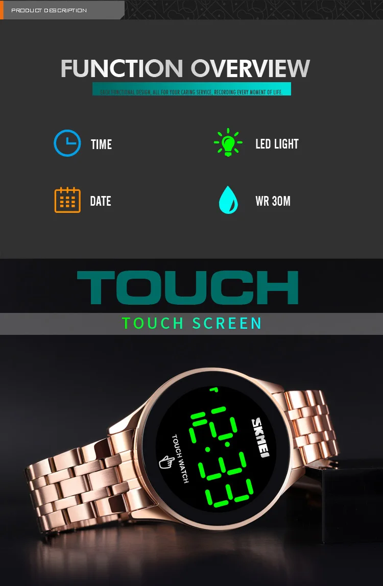 | SKMEI Simple Men Digital Watch Fashion Touch Screen LED Light Display 30M Waterproof Stainless Steel Strap erkek kol saati 1579 |
