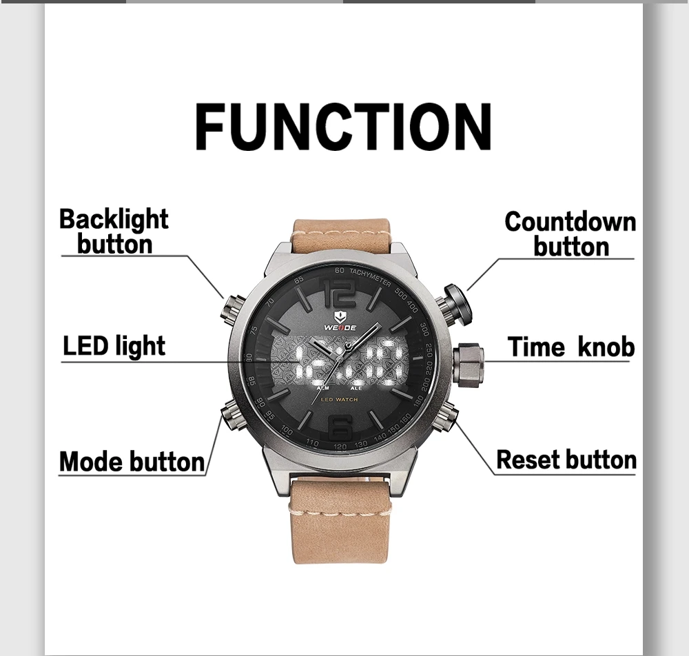 BRAND: WEIDE ITEM Number: WH6101 STYLE: SPORT,CASUAL,BUSINESS,OUTDOOR DISPLAY: ANALOG-LED DIGITAL MOVEMENT: Original JAPAN Miyota 2035 + LED digital movement Feature
